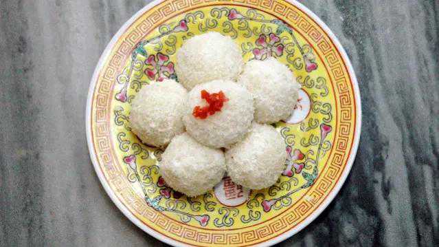 原料:糯米100克,梨脯、苹果脯、提子干各30克,熟芝麻、花生末各20克,桂花酱、玫瑰花瓣、熟面各适量。