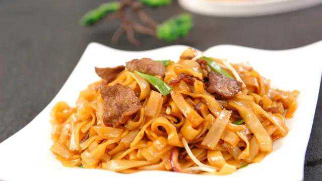 3.锅中烧油至7成热,放入牛肉片滑至断生,原锅烧油放入鸡蛋液炒成蛋花,接着放入洋葱丝、韭黄段,翻炒均匀,再加入河粉大火炒匀,接着加入生抽、老抽、耗油进行调味,最后加入牛肉片翻炒3分钟即可出锅。