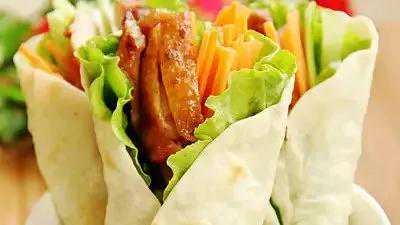 5.取一张面饼,铺上生菜叶,放上黄瓜条、鸡肉条,抹上甜面酱,卷起即可。