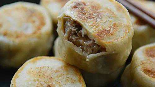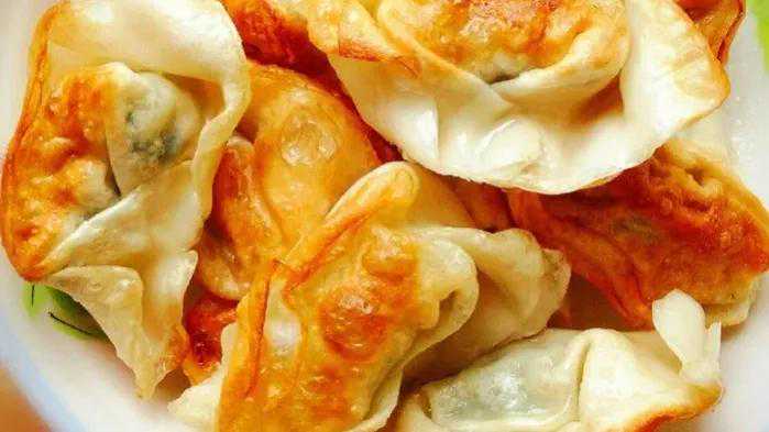 5.平底锅烧热放植物油,放入鸡肉馄饨,小火煎熟后盛出,蘸味汁食用即可。