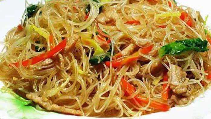 原料:干米粉、猪肉各150克,榨菜丝50克,青、红柿子椒各半个,鸡蛋2个,盐、味精、咖喱粉、植物油各适量。