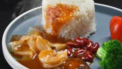 4.炒锅放植物油烧热,放入肉片、虾仁炒至变色,下入笋片、油菜、口蘑、料酒、蚝油、冰糖、胡椒粉、水淀粉炒匀,沿锅边淋入适量冷水,大火煮至汤汁黏稠,浇在热米饭上即可。