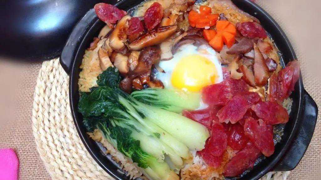 3.将腊鸭腿、腊肠、腊肉、油菜心平铺在米饭表层,小火煮至熟透,关火。