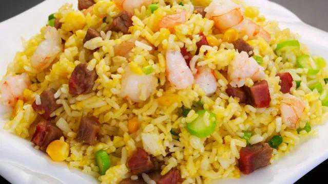 4.原锅洗净,放植物油烧热,下葱花、姜末爆香后,放入处理好的主料翻炒至熟,放入米饭,待米饭色泽光亮时,加盐翻匀即可。