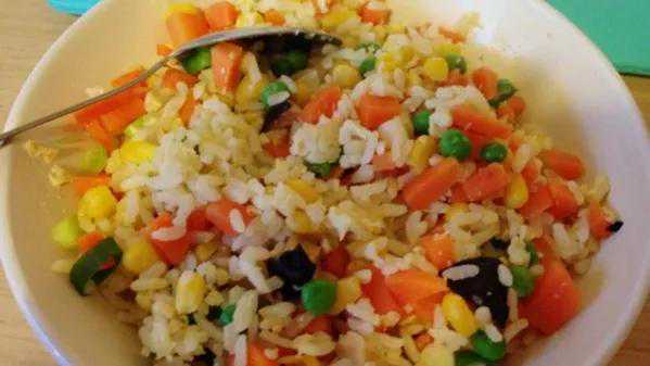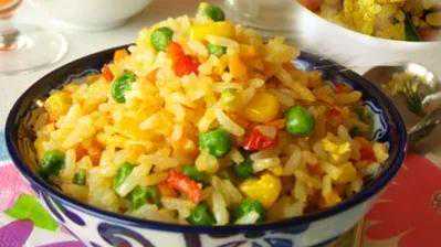 原料:大米400克,鸡蛋2个,青豆50克,胡萝卜半根,盐、味精、植物油各适量。
