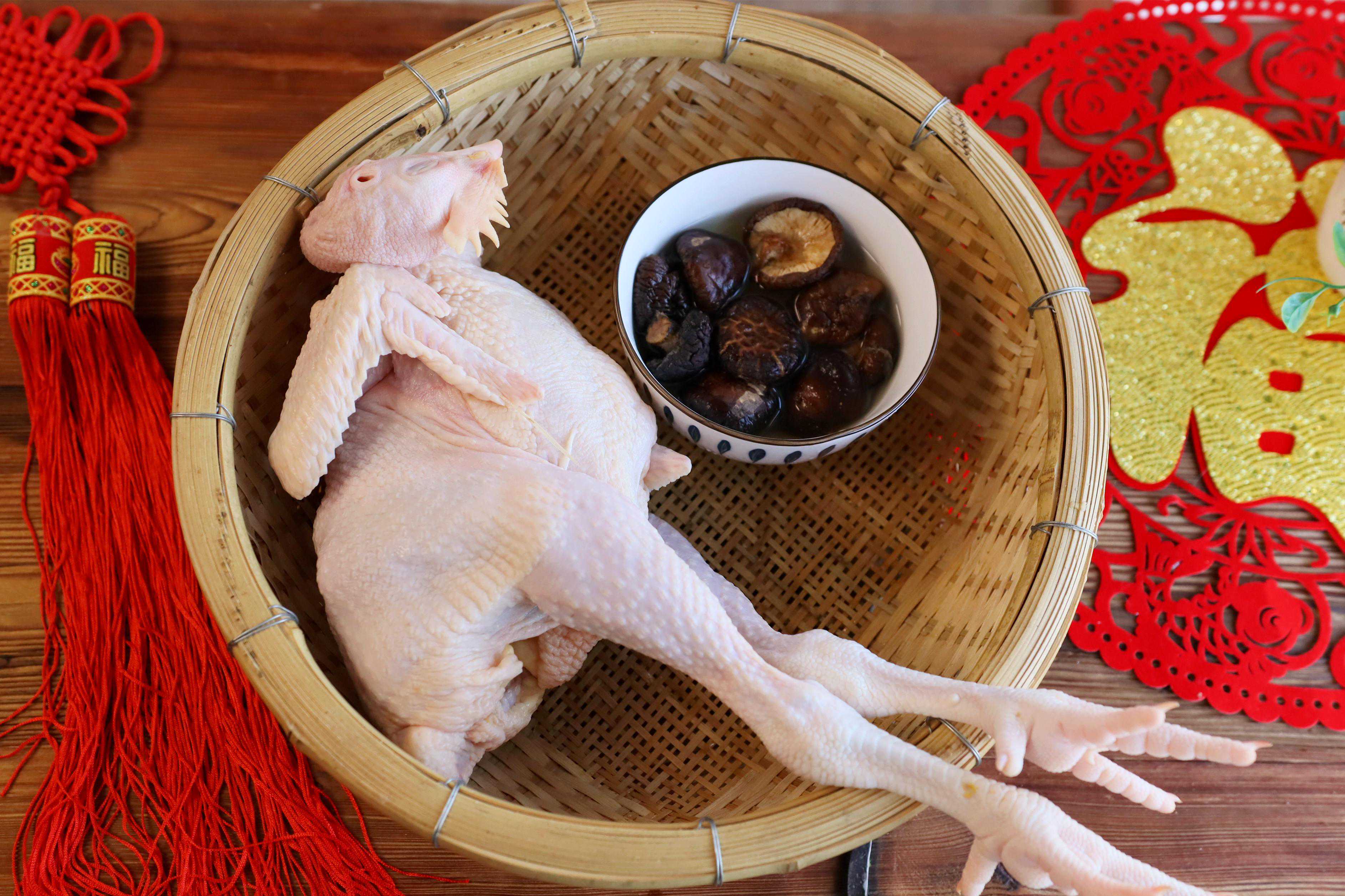 1、首先需要清洗三黄鸡,用流动的水将三黄鸡清洗干净,浸泡1个小时后捞出,用开水冲洗鸡肉表面去腥,然后将鸡爪塞入鸡肚子中,这样看起来较为美观,同时方便盖锅盖。