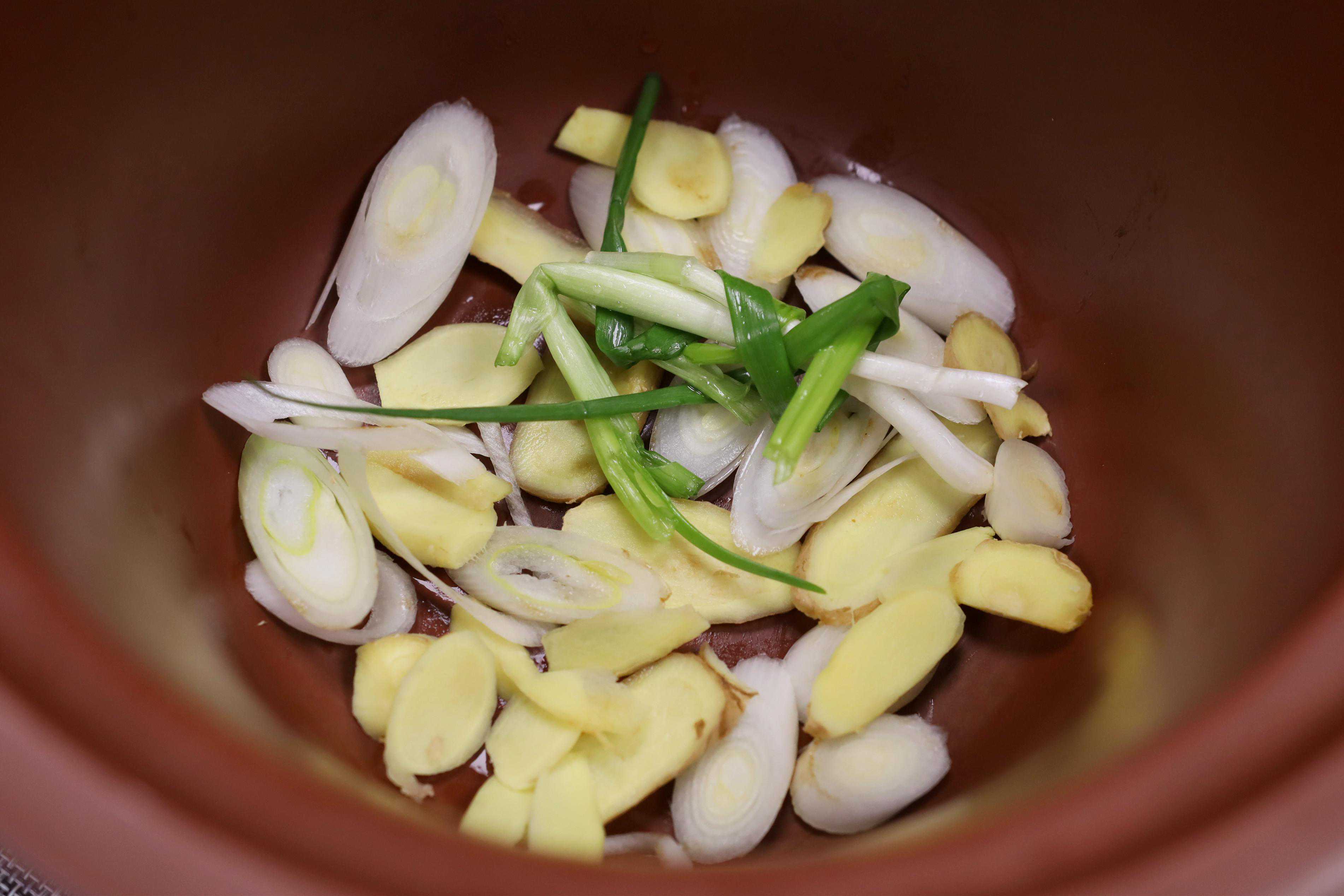 5、电饭锅冲洗干净、擦干水分,葱段和姜片铺底,小葱打结放到中间,尽量放得均匀一些,这样可以有效地避免鸡肉糊底。