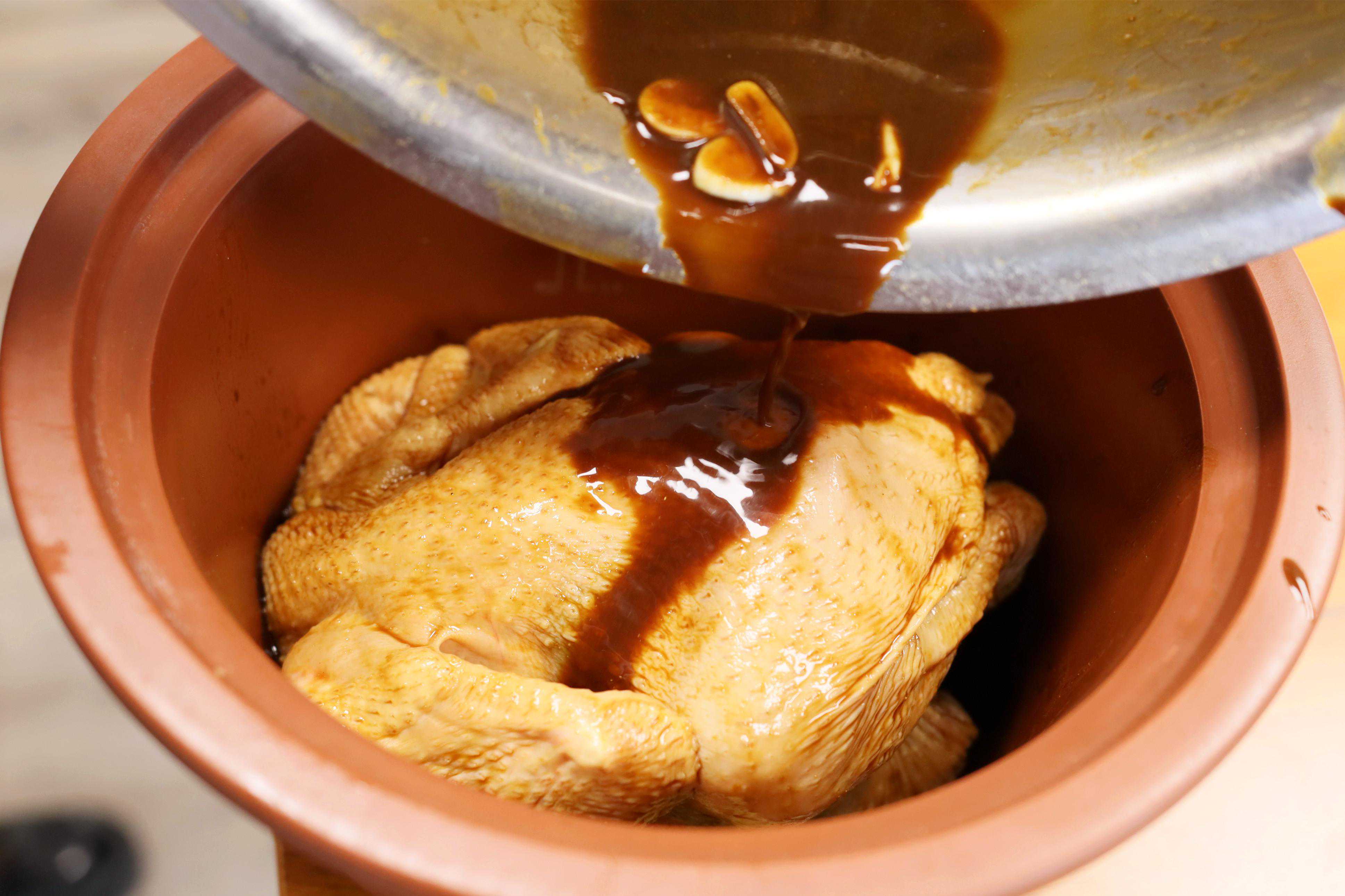 6、腌制好的三黄鸡放入电饭锅中,倒入剩余的腌料,均匀地涂抹开,盖上盖子,根据自己家的电饭锅设定时间,大约1个小时左右即可,一只肉质软烂、鲜香四溢的电饭锅焖鸡就做好了。