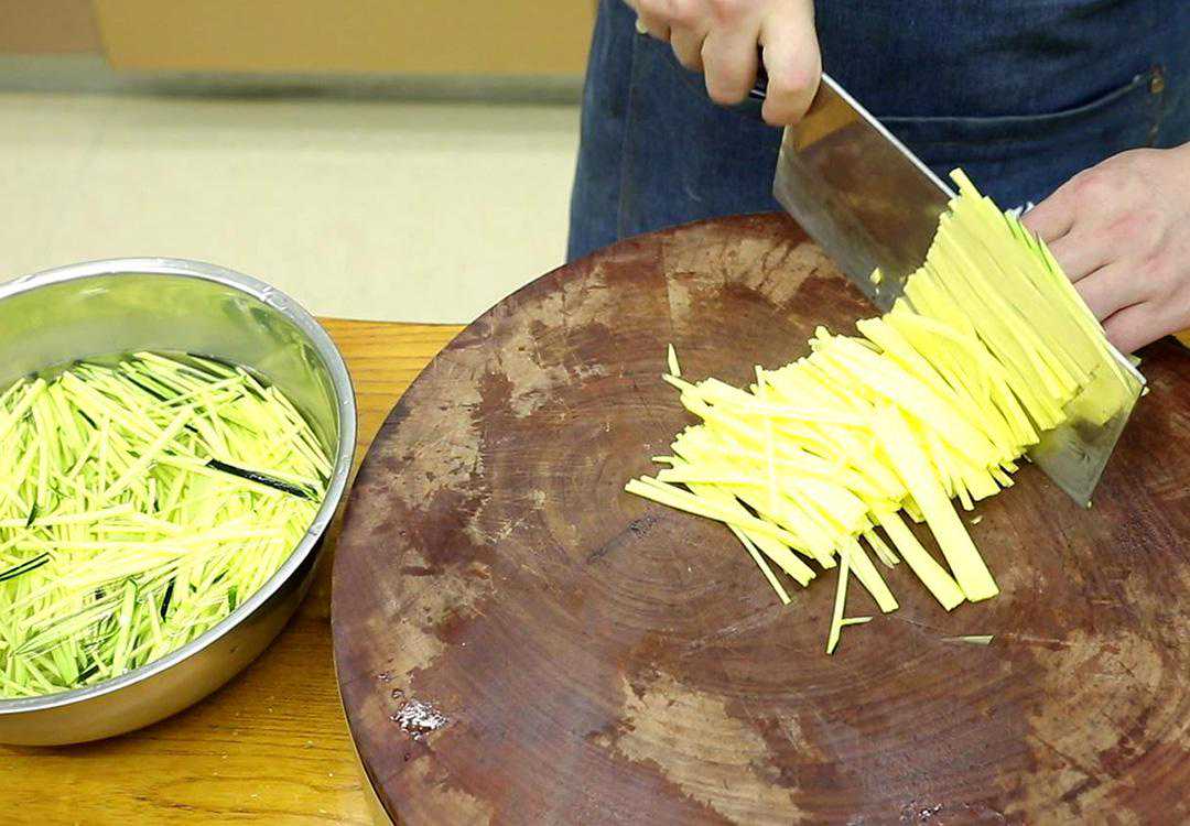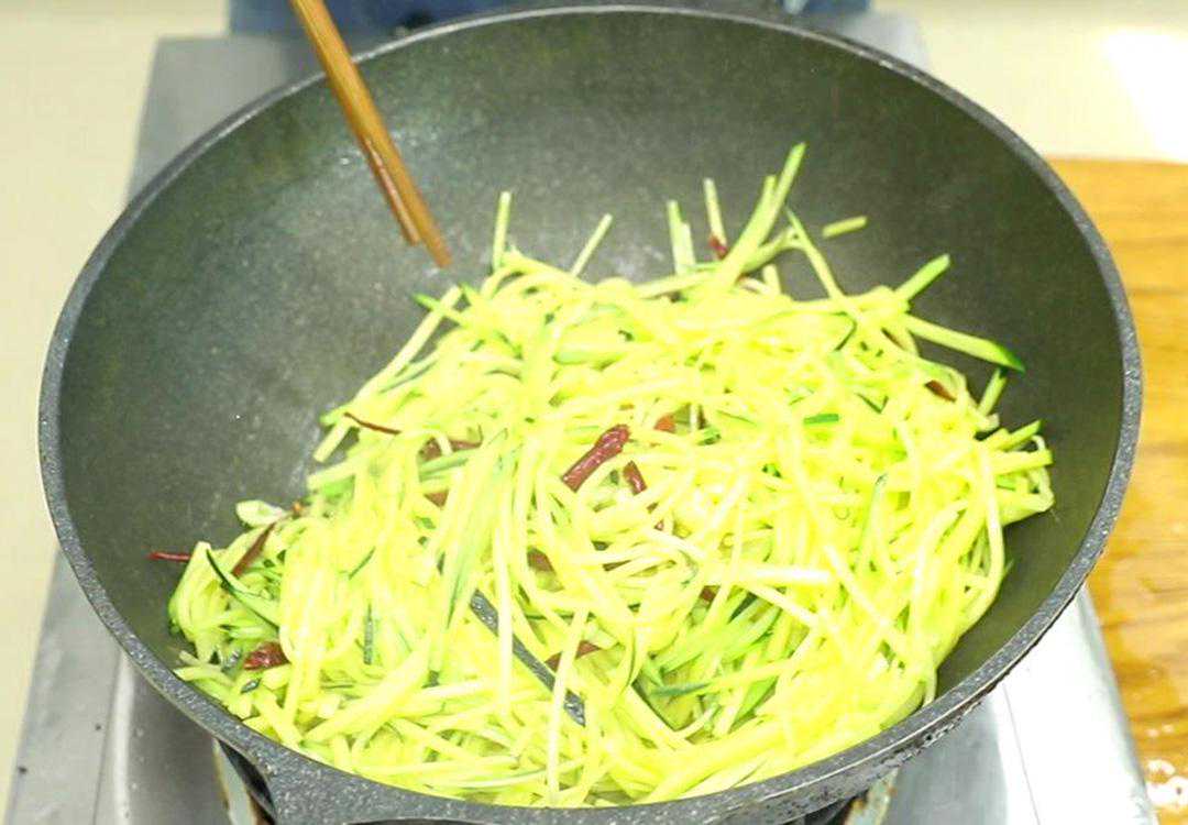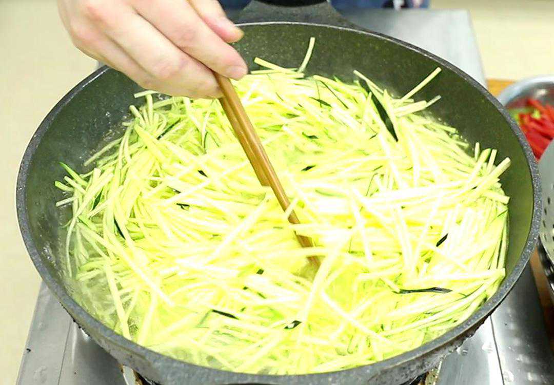 3.烧半锅开水,淋入少许白醋便于保持脆嫩,把南瓜丝倒进去,快速焯烫3秒钟立即倒出来,并迅速用清水冲洗过凉,南瓜丝切记不能烫太久不然就煮面了。