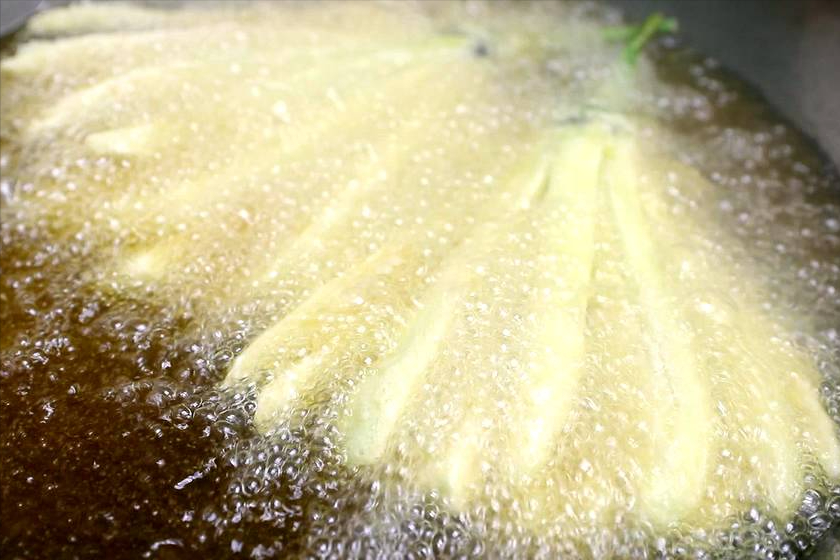 3.锅内烧油,油温烧至6成热时,把茄子依次放入锅中。保持小火慢炸,并把粘连在一起的用筷子打散。等茄子炸酥,炸成金黄色时倒出来控油。