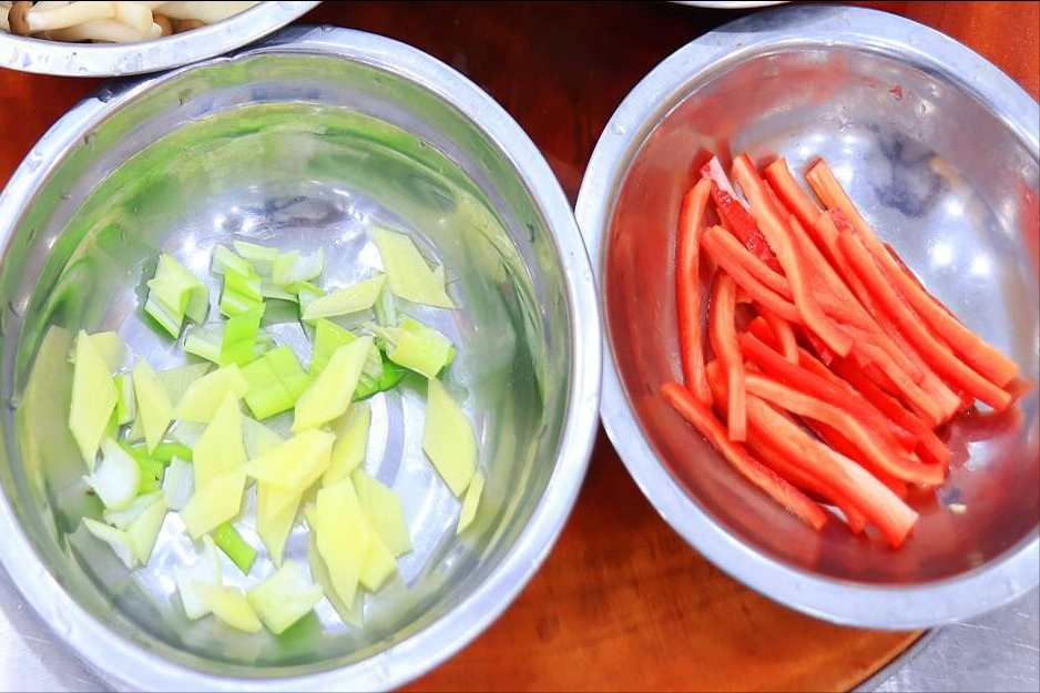 2.准备红椒半个,切成细丝。准备大葱一段,切成葱花。准备生姜一块,切成菱形片。