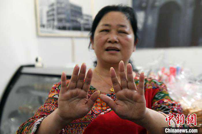 由于长期埋首制作糕点,江倚文落下不少“职业病”——十指指纹几乎被磨平,手上也有明显的烫伤痕迹。“我是一个‘糕点痴’,我对归侨美食太热爱了。”她摸着自己的手指说道,“虽然很辛苦,但每研究出一款新的美食,内心的快乐无法用语言表达。”
