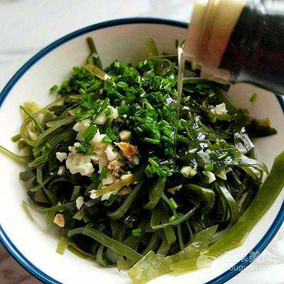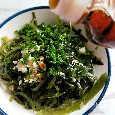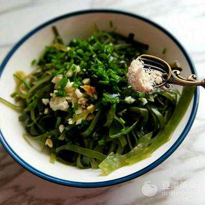 5、将淋干水份的海带放入器具中,加入切碎的蒜和葱花,姜末。