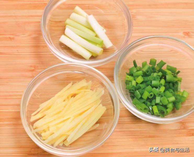 3生姜洗净,去皮,切成姜丝;香葱洗净,将葱白切成段,葱叶切成葱花。
