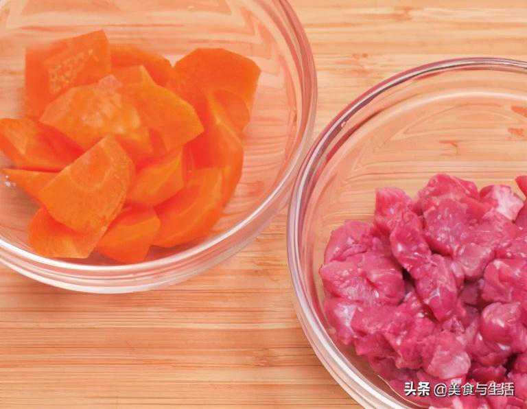 4牛肉洗净,切成0.5厘米见方的肉丁;胡萝卜去皮,洗净,切成2厘米左右的滚刀块。