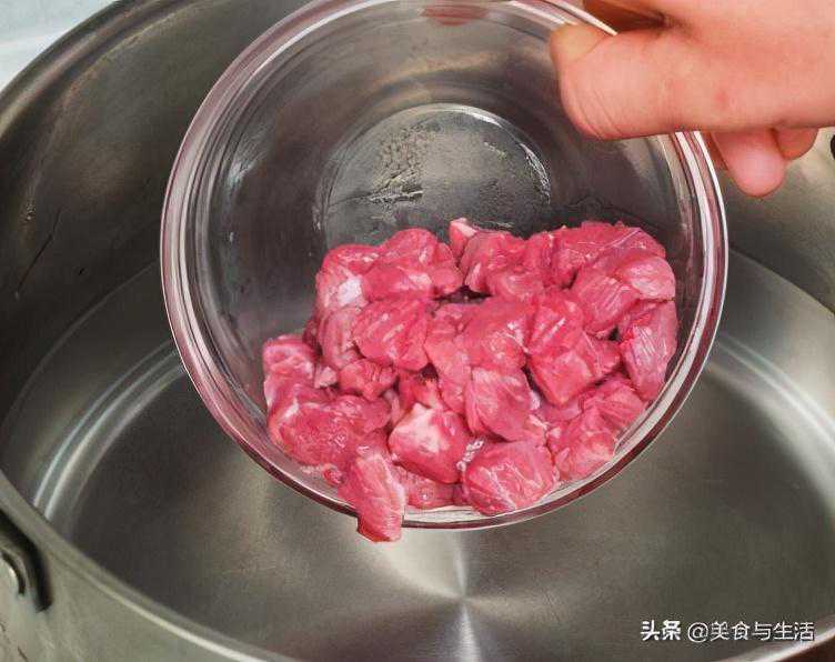 5锅中放入牛肉丁,加入没过食材的凉水,煮开后撇去表面的浮沫,将牛肉丁捞出再次清洗干净。