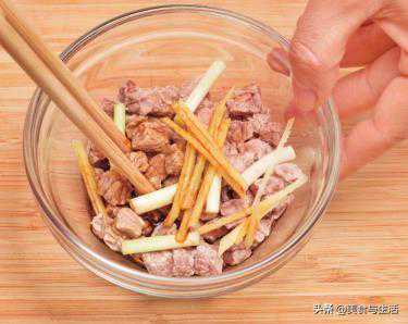 6将牛肉丁放入大碗中,加入料酒、生抽、葱段、姜丝抓匀,腌制20分钟。