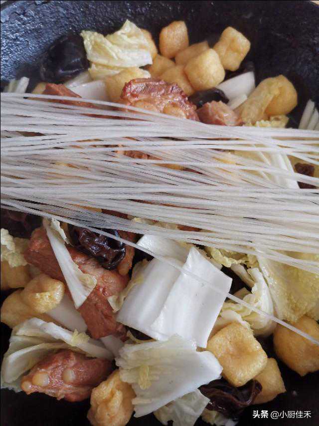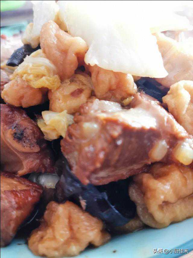 3.四十分钟后,排骨已经入味软烂。加入白菜块,木耳,豆泡(豆腐),翻炒几下,最后加入粉条,盖盖,小火炖十五分钟。