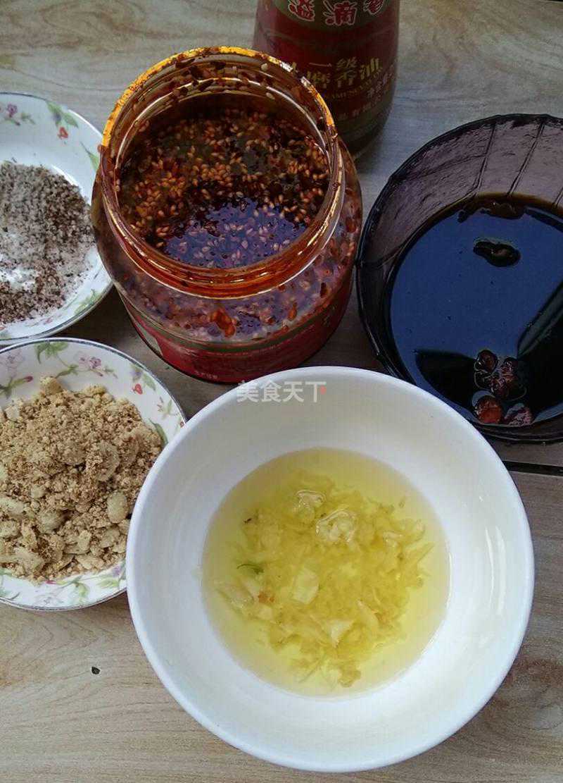 3.麻酱、酱油、辣椒油、香油、白芝麻调成汁。