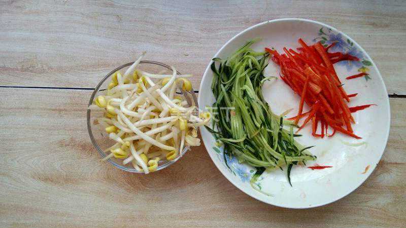 3.准备些吃凉面的鲜蔬,豆芽,黄瓜丝,红椒丝。