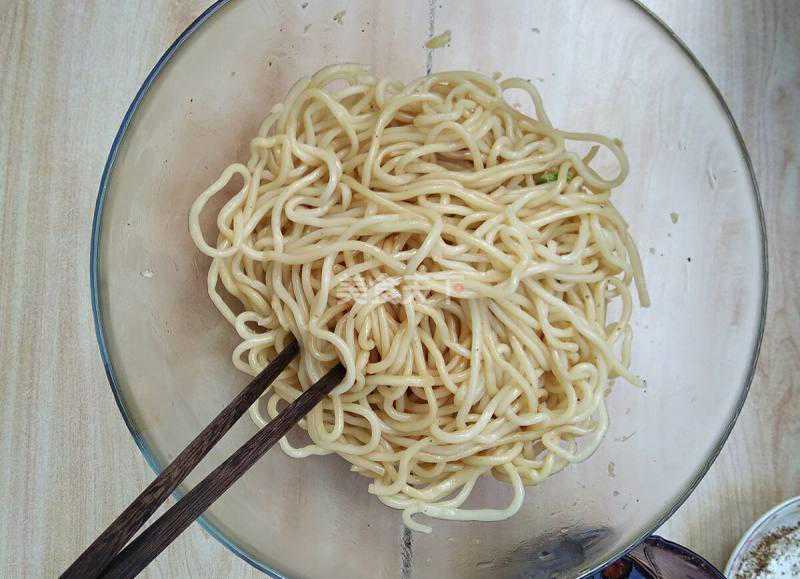 4.再加入适量的食用油(花椒油也可)戴上一次性手套抓匀或用筷子拌匀,使面条上都裹上油,防止面条粘连。