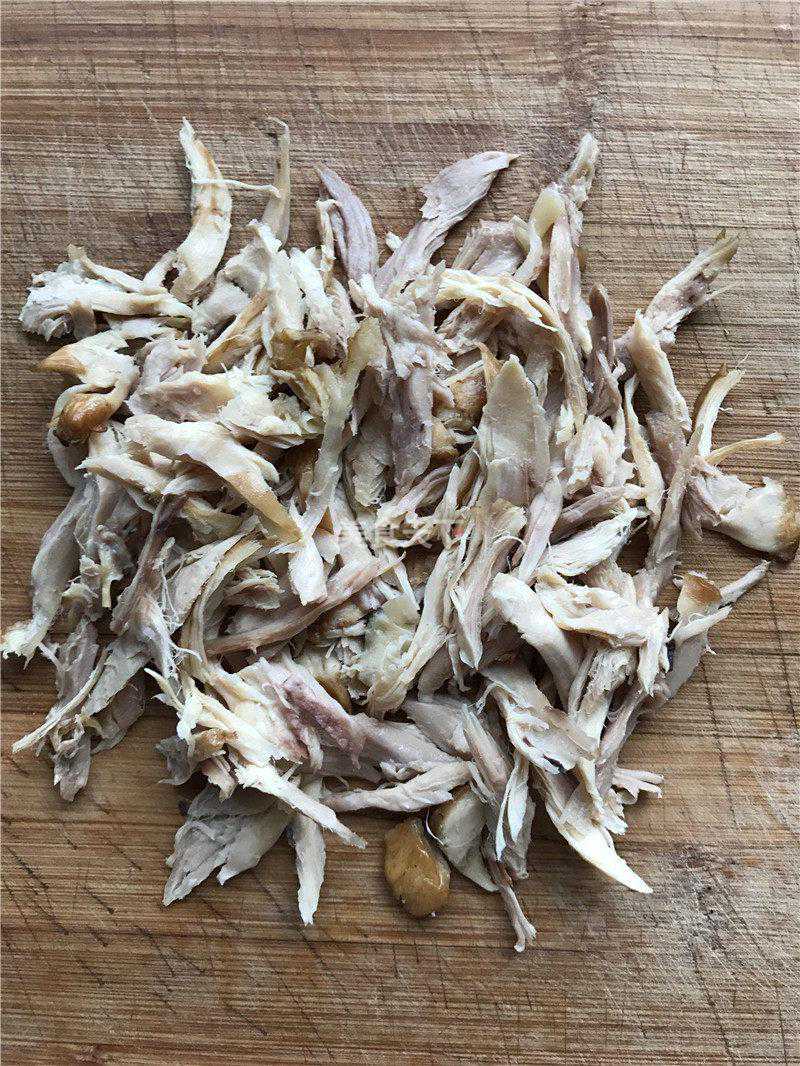 1.鸡腿用擀面杖捶打一番,用手轻轻的撕成细丝。