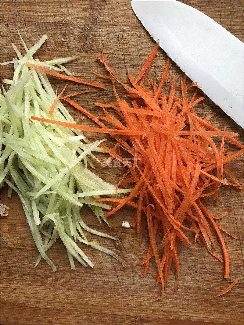 2.黄瓜和胡萝卜切丝。