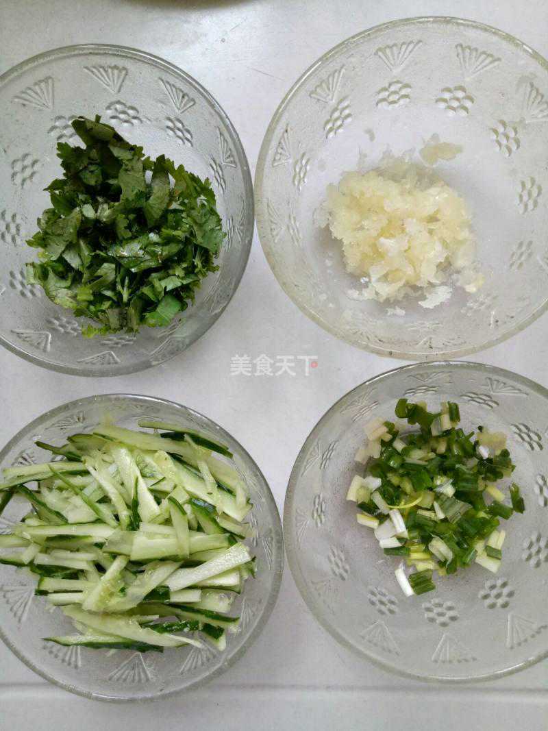5.黄瓜切丝,葱切葱花,蒜压成泥状,香菜切碎备用。