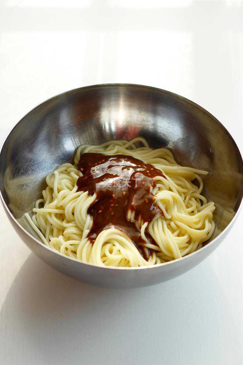 6.麻酱汁拌在面中,调和均匀即可。