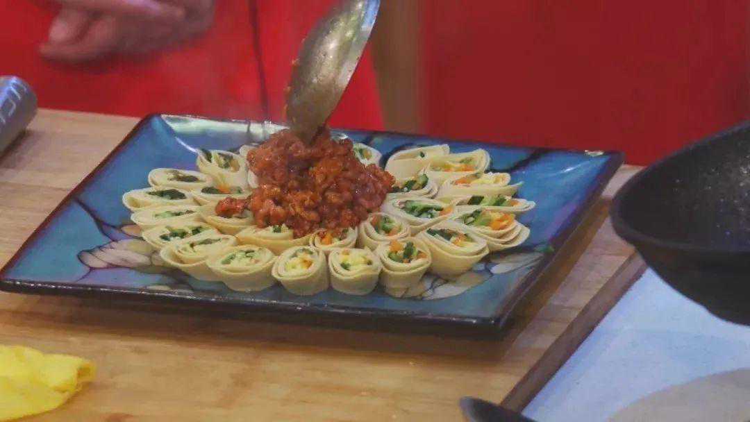 ②卷豆皮:将小萝卜缨、黄瓜丝、胡萝卜丝和蛋丝混合,卷入豆皮中,改刀成块。