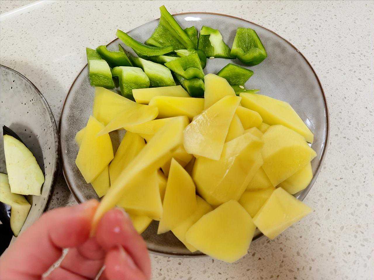 2、另外再准备一个土豆,一个青椒,个头适中的就好,三样蔬菜茄子和土豆是主要的,青椒适当点缀一下即可,土豆切滚刀块,青椒切块,放碗里拍上一层淀粉。