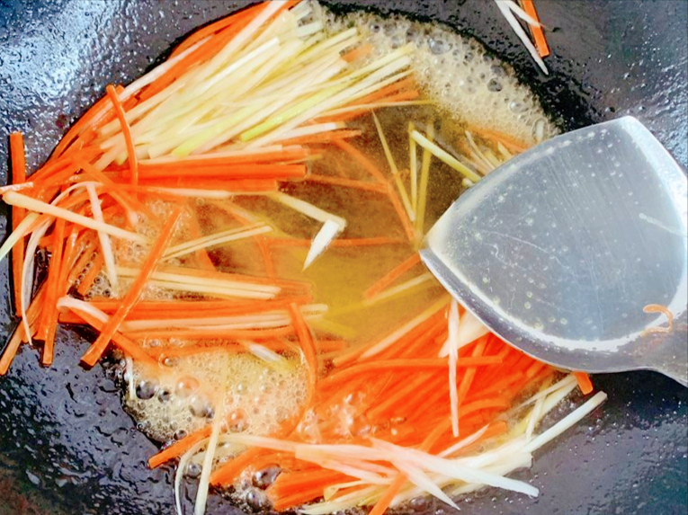 6、起锅烧油,放入20克白醋,20克白糖,糖与醋的比例为1:1,再加入3克生抽,2克食盐,煮至黏稠,倒入胡萝卜和葱丝。