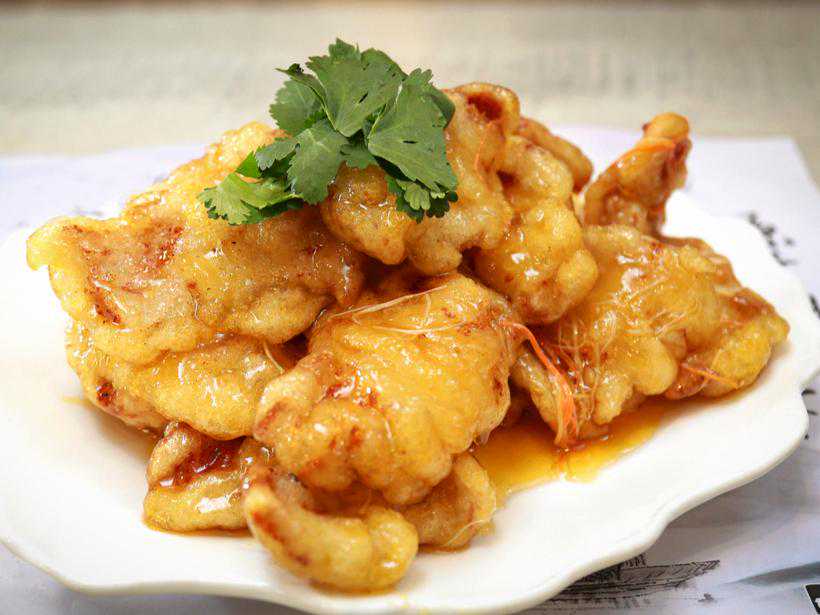 5、复炸好之后,控油捞出,第一次炸至定型变色,第二次高温复炸,可以让肉片表皮更酥脆,里面熟得更均匀,外酥里嫩的技巧,就在这一步,不可忽略。