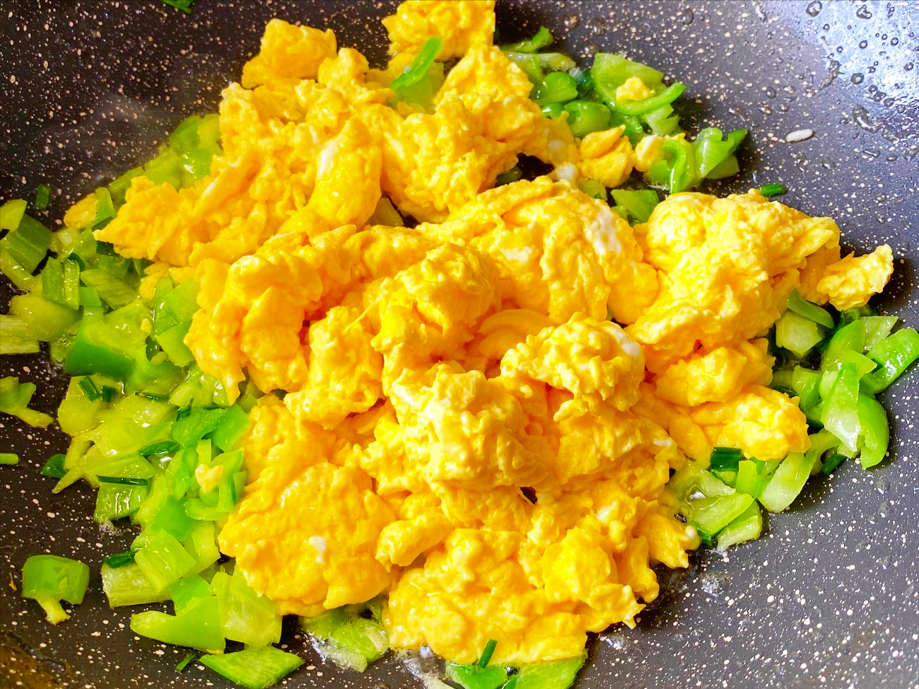 2、重新再放油,倒入葱花爆出香味,接着再倒入炒好的鸡蛋,重新回锅,翻炒均匀。
