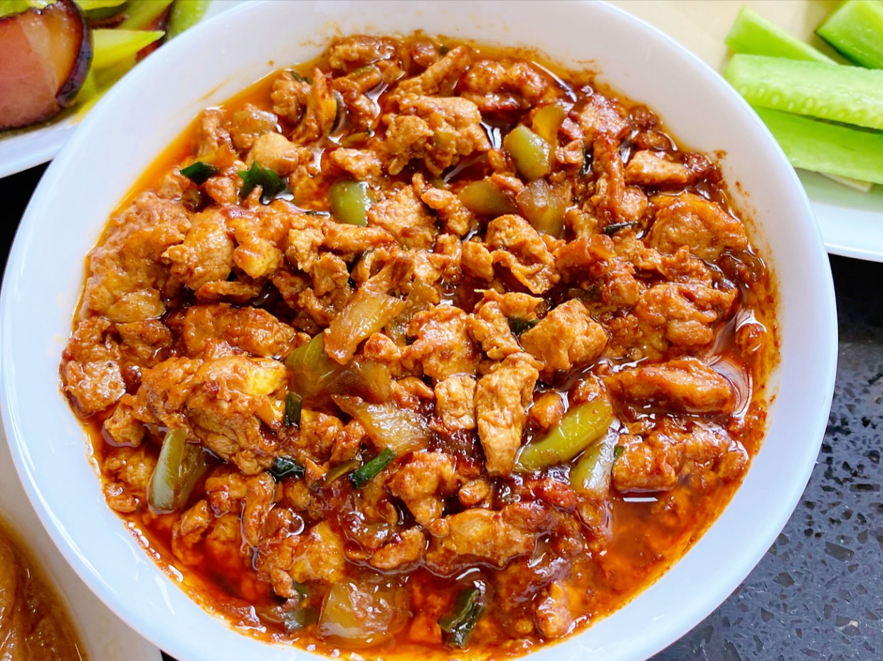 5、因为各种酱料的添加,就没必要放盐了,咸味绝对够,如果你口味重,可以尝一尝再放盐,翻炒一会儿,用中火收汁,看差不多就可以出锅了。