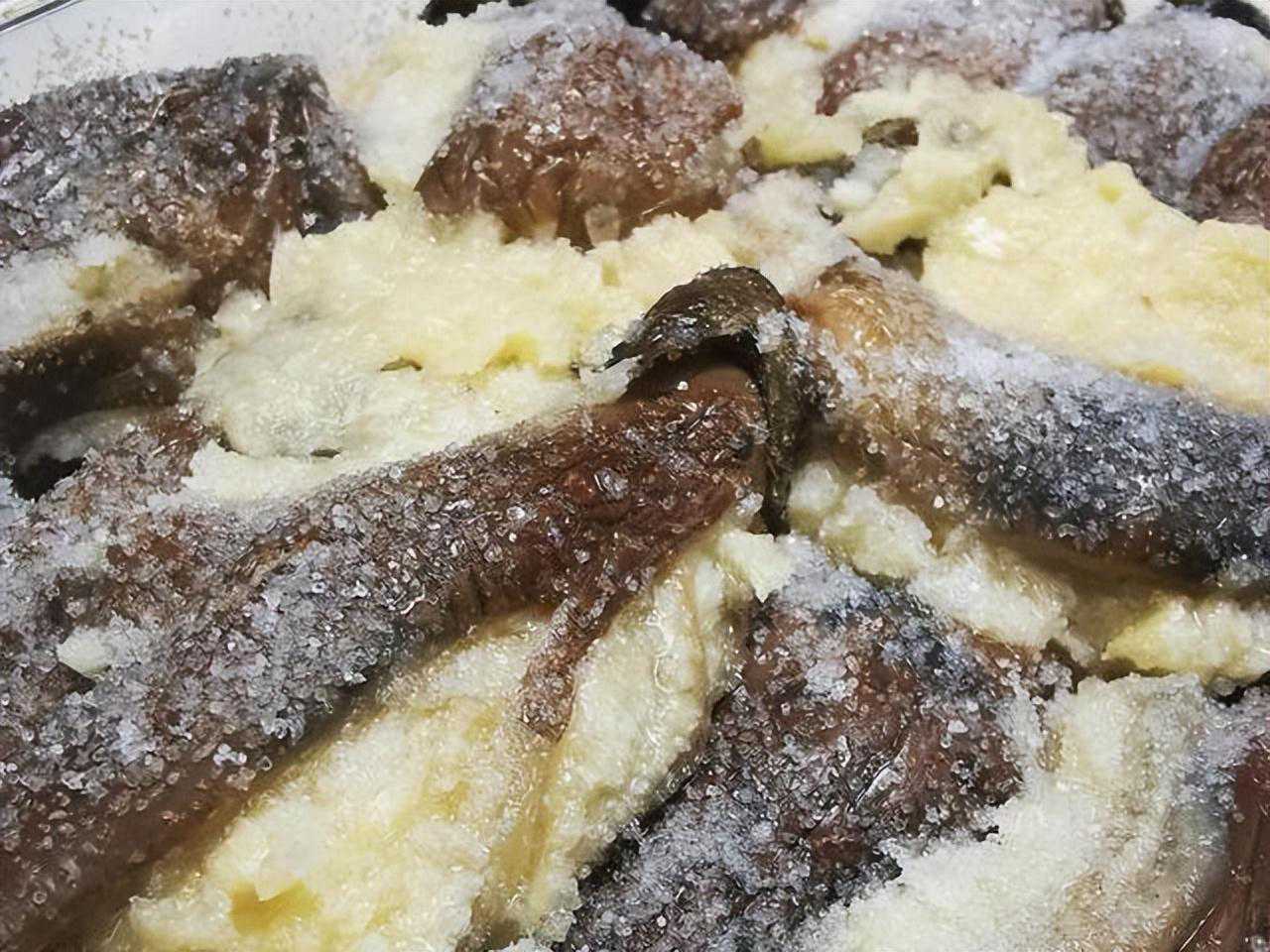 5、此时的茄子,也晾得差不多了,如图所示,将茄子轻轻掰开,小茄子肉很紧实,把大蒜泥釀进去,不多不少铺一层。