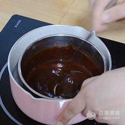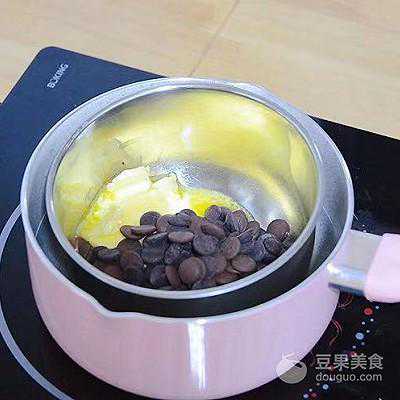 2、将黄油、黑巧克力放入盆中,坐温水中。