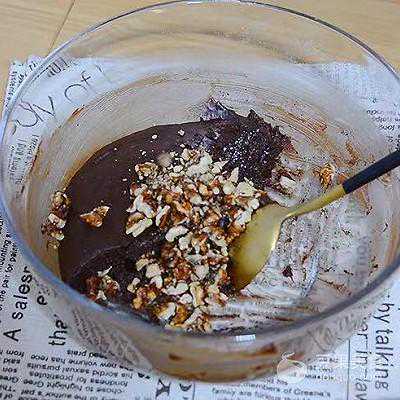 6、倒入融化后的黄油黑巧克力混合物,搅匀。