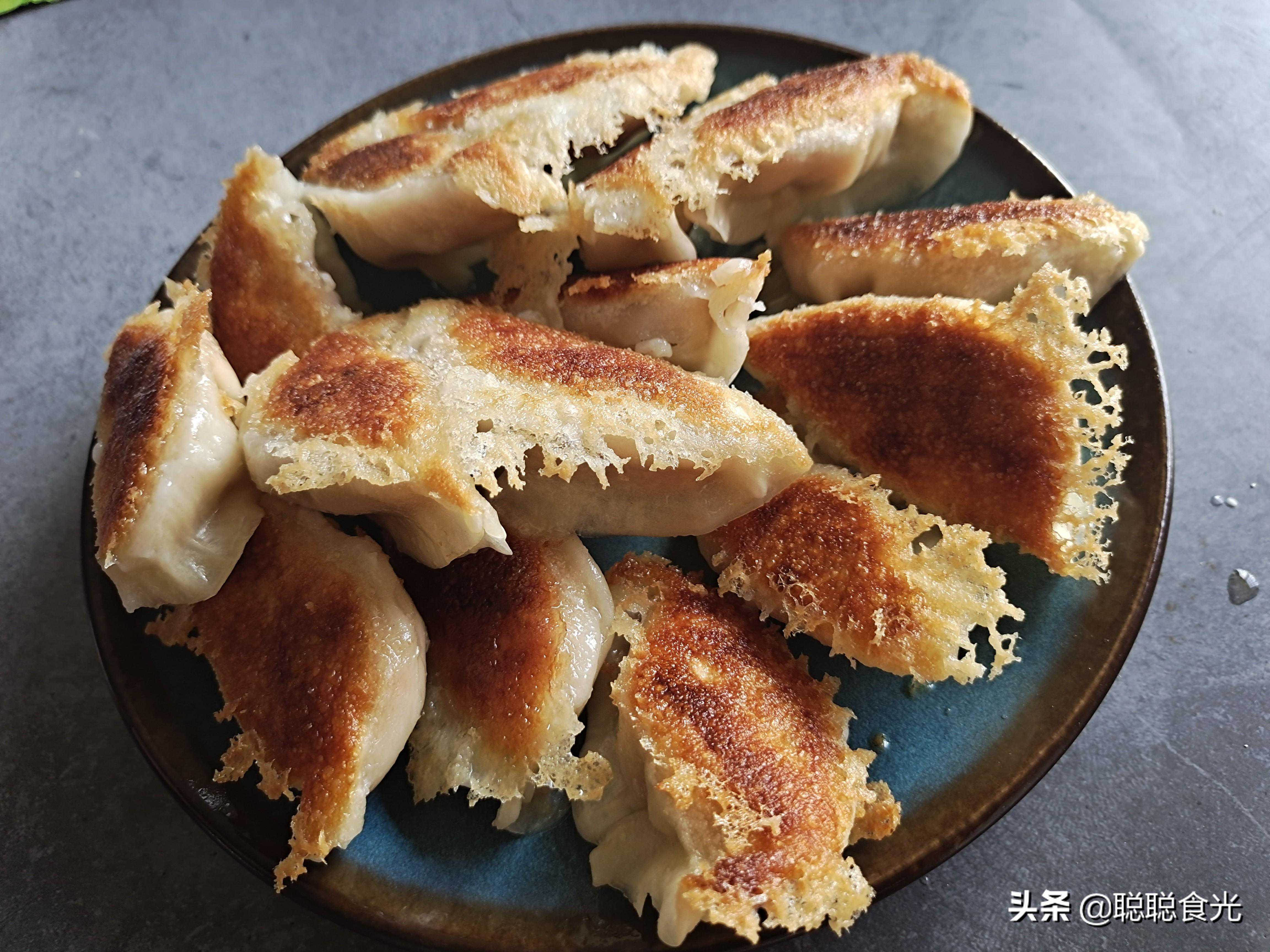 5、平底锅中倒油,放入包好的饺子,然后加入适量的面粉水,盖上锅盖焖5分钟。