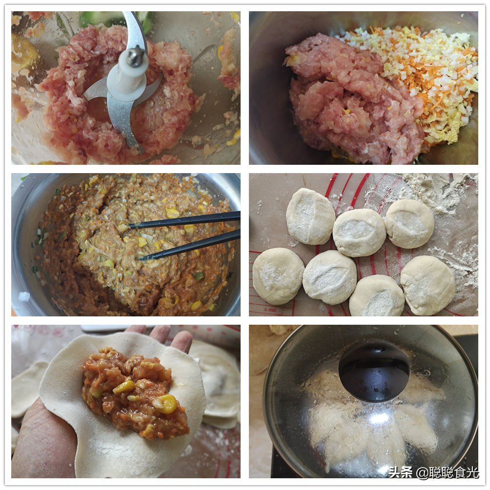 【食材】面粉、牛肉、白菜、胡萝卜、玉米、葱、姜、生抽、盐、花椒粉、胡椒粉