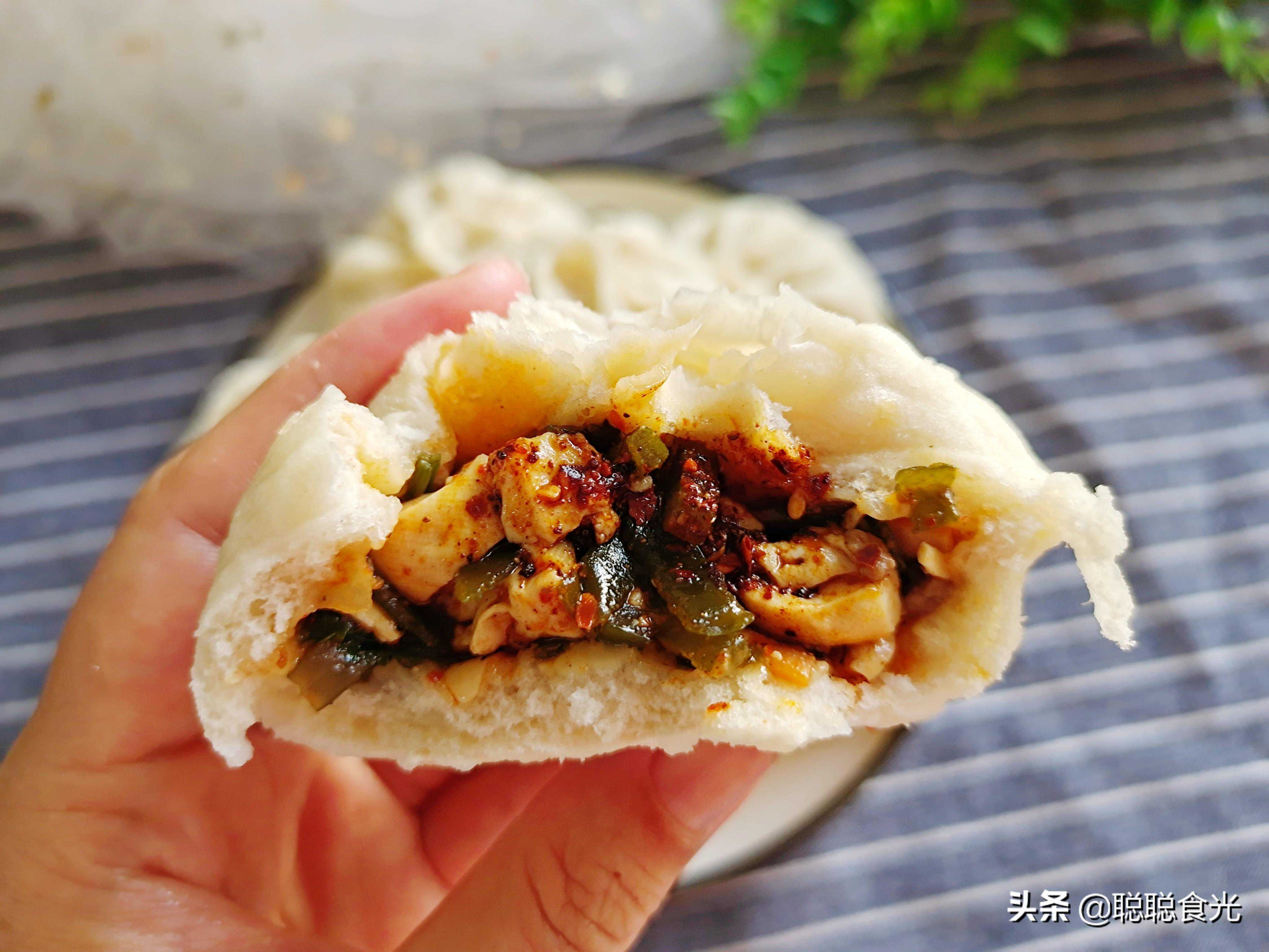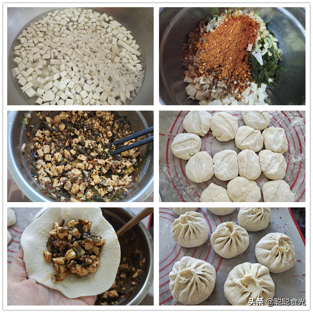【食材】面粉300克,酵母3克,糖10克,水170克,豆腐1块,海带适量,小葱,青椒,海米,榨菜,辣椒粉2勺,花椒粉1勺,蚝油适量,盐1勺,糖1勺。