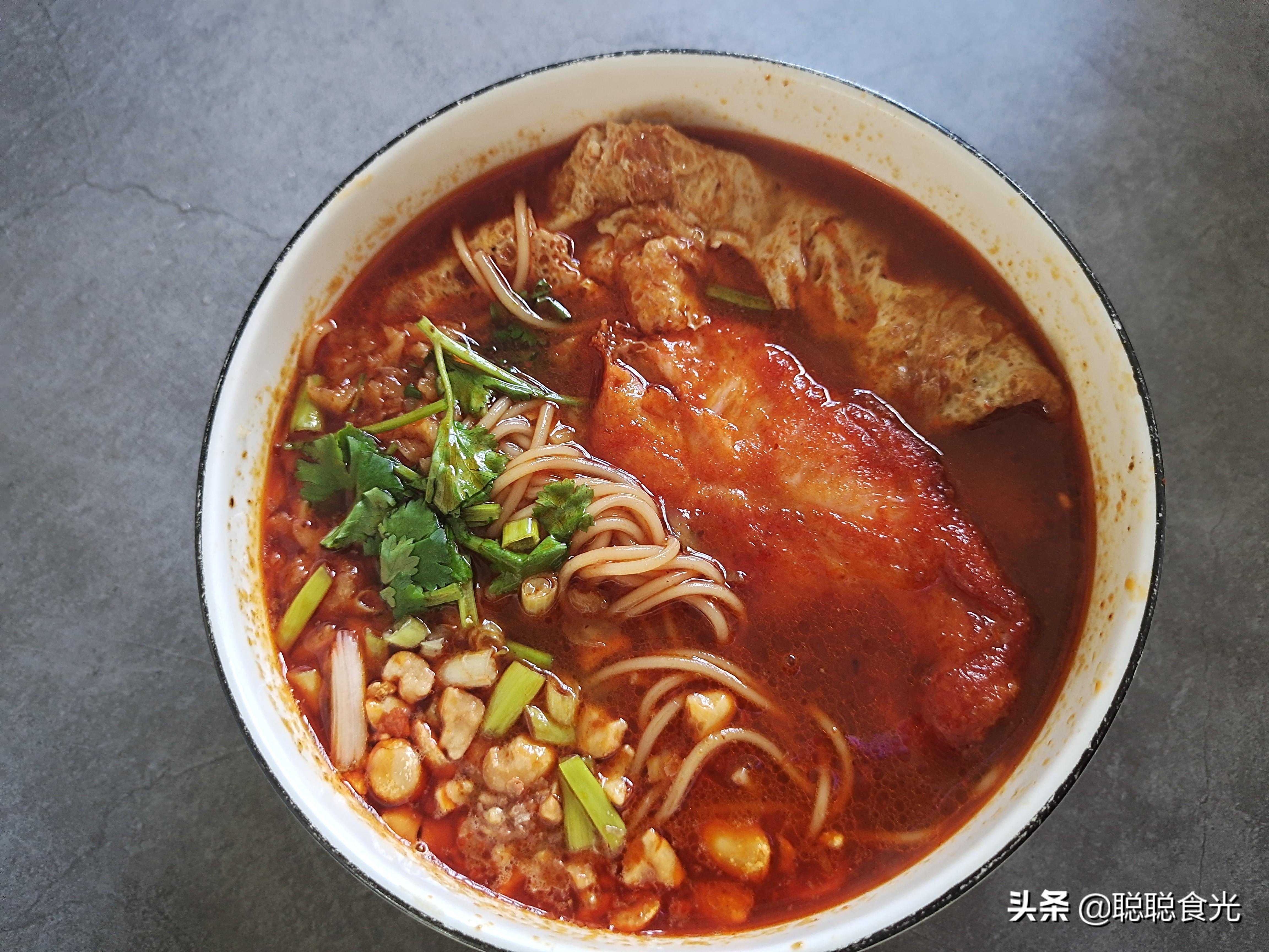 9、把米粉放入碗中,加入牛肉汤,再依次摆入牛肉、豆干、花生米、鹌鹑蛋和青菜,最后淋入一大勺油辣子,就可以了。
