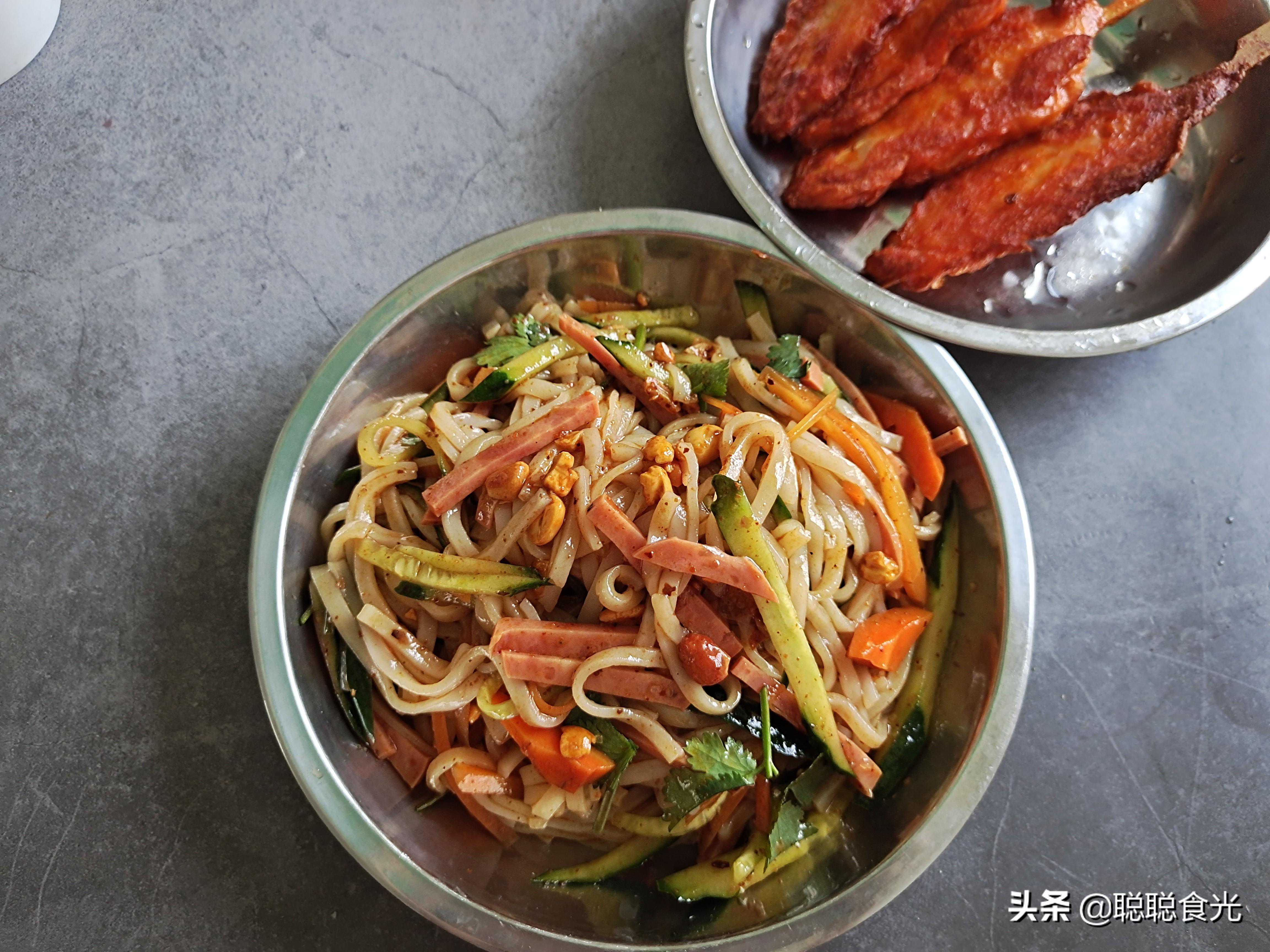 3、把控干水分的米粉盛入盘中,放上一些黄瓜丝、胡萝卜丝和香肠丝。
