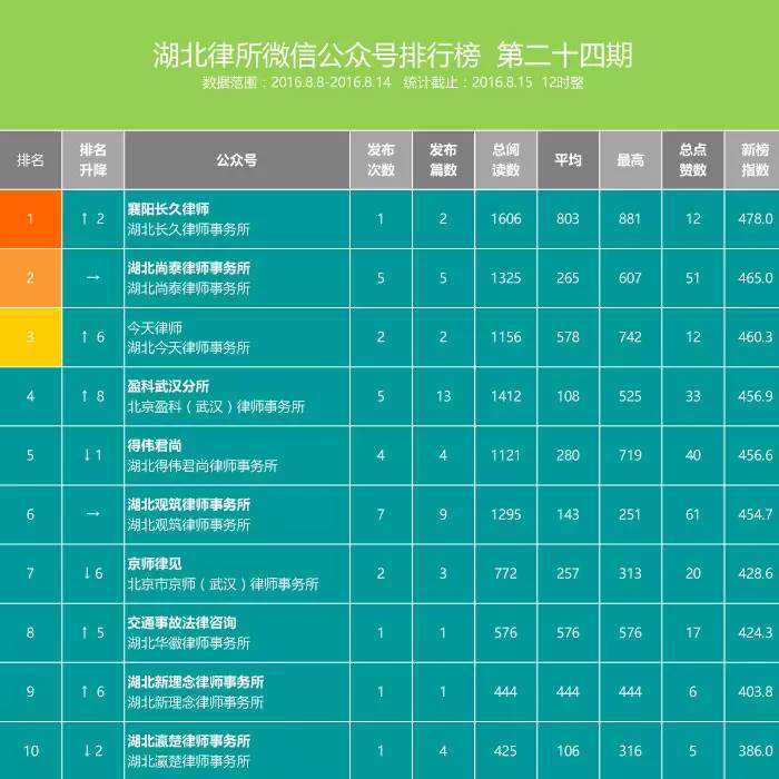 本周格局有较大的变化,前三名分别为襄阳长久律师,湖北尚泰律师事务所,今天律师。