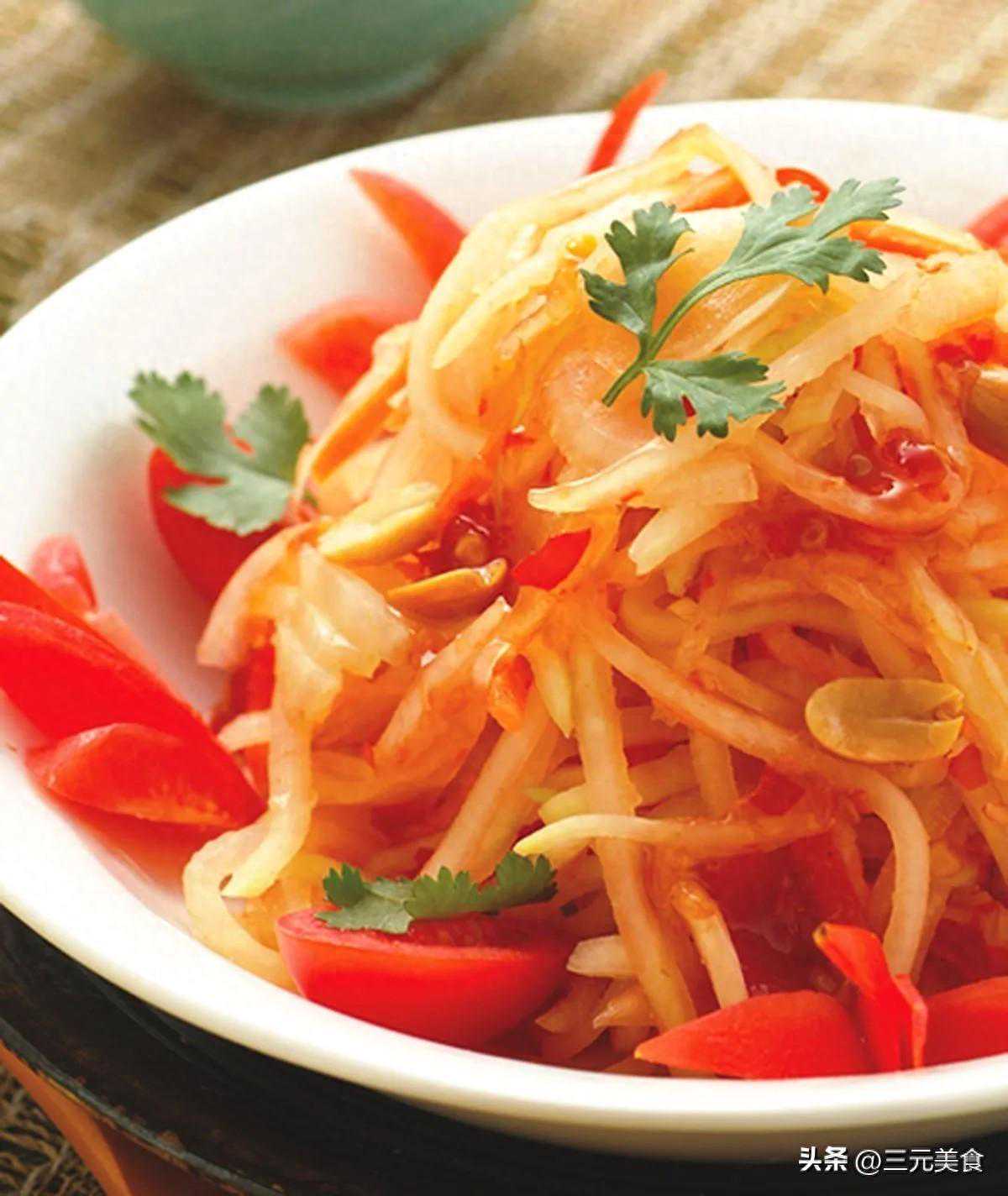 材料:青木瓜300克、柠檬1颗、洋葱丝、圣女果100克、酥花生30克、虾米20克、鱼露2匙、细砂糖2小匙、小米辣椒3根