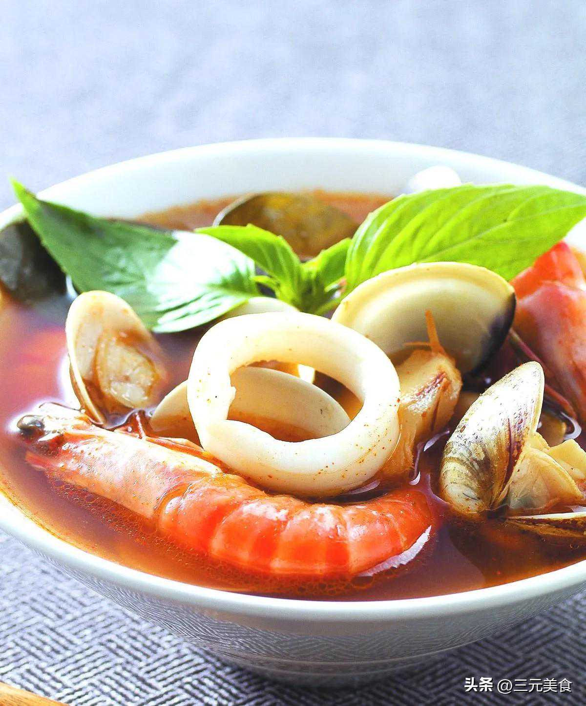 材料:虾200克、鱿鱼150克、蛤蜊200克、洋葱丝40克、辣椒末10克、草菇适量、番茄适量、香茅段2支、南姜片15克、柠檬叶3片、鱼露2匙、椰糖1匙、柠檬汁1大匙