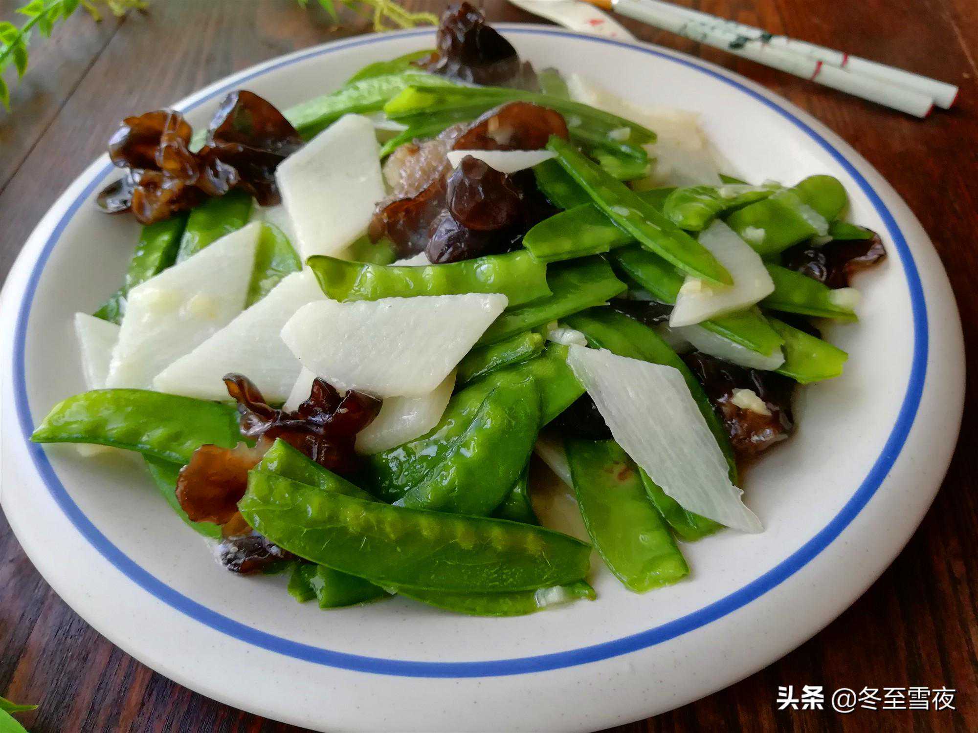 材料:荷兰豆250克、山药250克、木耳适量、油盐适量、大蒜2瓣、鸡精1茶匙、水淀粉适量、