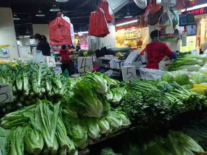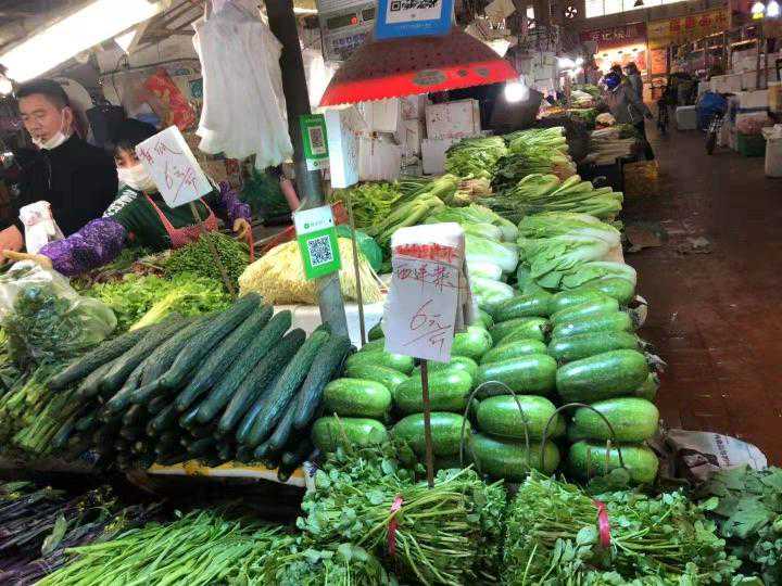 “市场超市菜品依然丰富,粮油米价格平稳基本不变,而猪肉比年前贵了8、9元一斤,蔬菜比年前贵1-2元,总体贵得不多。虽然每个品种都有所上升,但赶上春节和疫情,这个价格我们还能接受。”此外,像鸡档、猪肉档基本都开了,菜档少些。固定的菜肉档口总体超过一半营业,大概有三四十家,加上流动的卖菜摊位就更多了。供应都很足,就是来买菜的人少了。