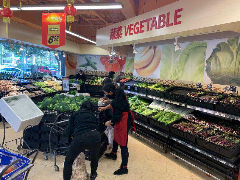 在广州白云区某大型小区旁的这家超市,与此前到下午就出现蔬菜空栏的情况不同,这次记者前往下午2时许前往,仍能看到满货柜的蔬菜,不少市民仍前往选购。市民李先生告诉记者,现在过年期间起床比较晚,所以等到这个时候来买菜,本来是打算买些肉类,没想到今天还能买到蔬菜。蔬菜价格也比较适中,奶白菜9.98元/公斤,菜椒15.98元/公斤。