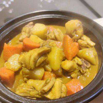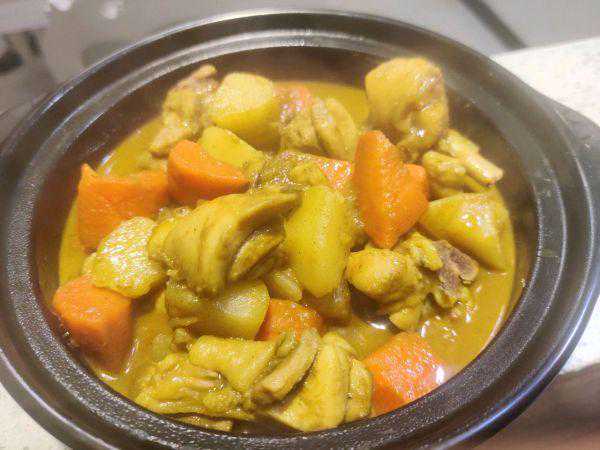 5、锅热倒油,小火放咖喱炒化放椰浆煮一分钟。